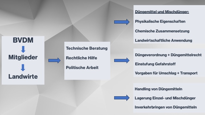 Der BVDM hat sich zum Ziel gesetzt, die wissenschaftlichen Erkenntnisse im Bereich der Pflanzenernährung und insbesondere des Einsatzes von Mischdüngern in Deutschland und angrenzenden Ländern weiterzuentwickeln.